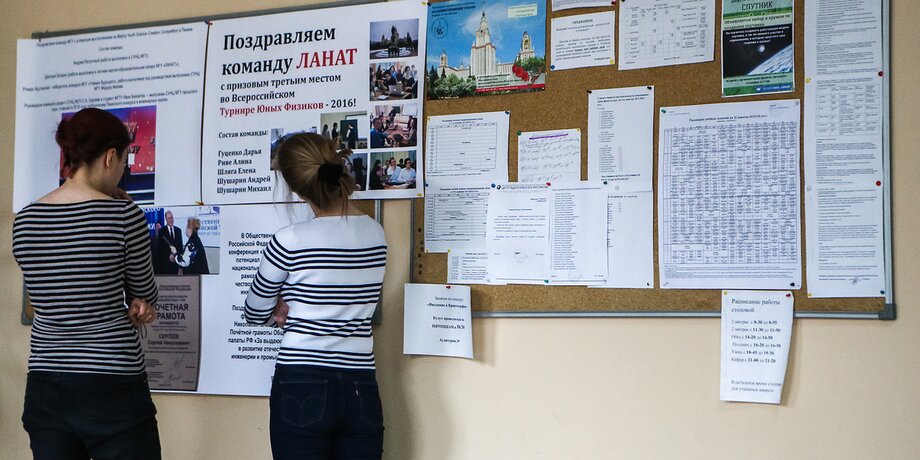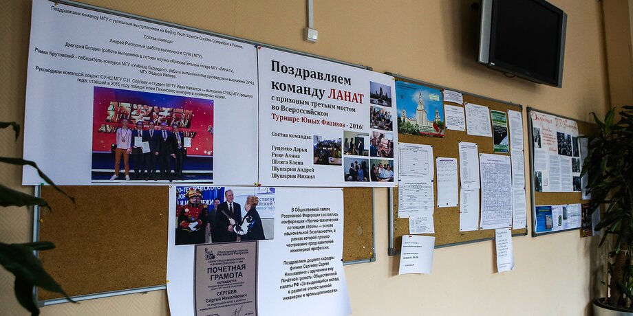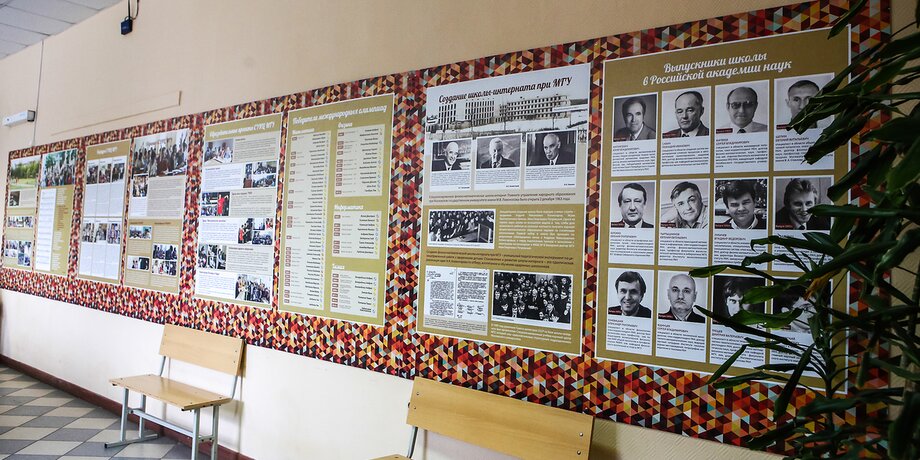 Холл СУНЦ МГУ – это большая доска почета. На стенах – стенды об истории школы, фотографии выпускников – ныне академиков и членов-корреспондентов Российской академии наук, перечень 73 победителей международных олимпиад. Возле пальм стоит тенистый стол. На кожаном диване – две девушки. Одна в платье и лакированных туфлях на 10-сантиметровом каблуке, другая в красных кедах, джинсах, с накладными наушниками. Мимо пробегает мальчик в черных сланцах. Следом идет юноша в костюме с красным галстуком. На многих ребятах – фирменные футболки с разных соревнований.