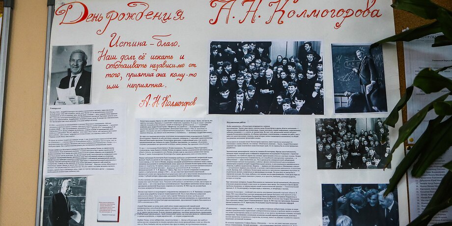 Всех посетителей СУНЦ МГУ сразу за входной дверью встречает бронзовый бюст академика Колмогорова. Слева – напечатанный на баннере его графический портрет, под которым стоит ваза с шестью гвоздиками. В отличие от бюста, этот портрет – временное явление. Его выставляют только ко дню рождения основателя школы и Колмогоровским чтениям – международной научной конференции, которая идет в первую неделю мая. Есть еще одна традиция к этим датам – группа школьников прибирает могилу академика на Новодевичьем кладбище.