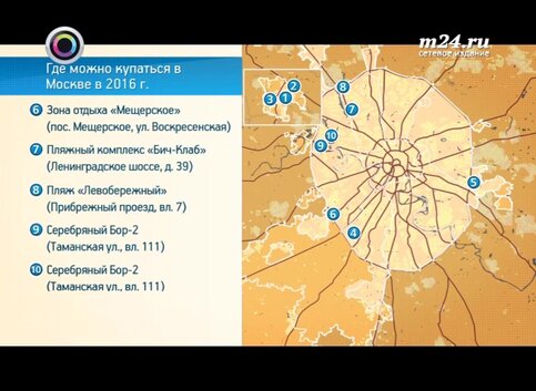 10 зон отдыха с купанием ("Большой городской пруд", "Школьное озеро", "Черное озеро", "Тропарево", "Озеро Белое", "Мещерское", "Бич Клаб", "Левобережный", "Серебряный Бор – 2", "Серебряный Бор – 3") находятся под контролем столичного Роспотребнадзора, за пляж "Большой Садовый пруд" отвечает Федеральное медико-биологическое агентство.