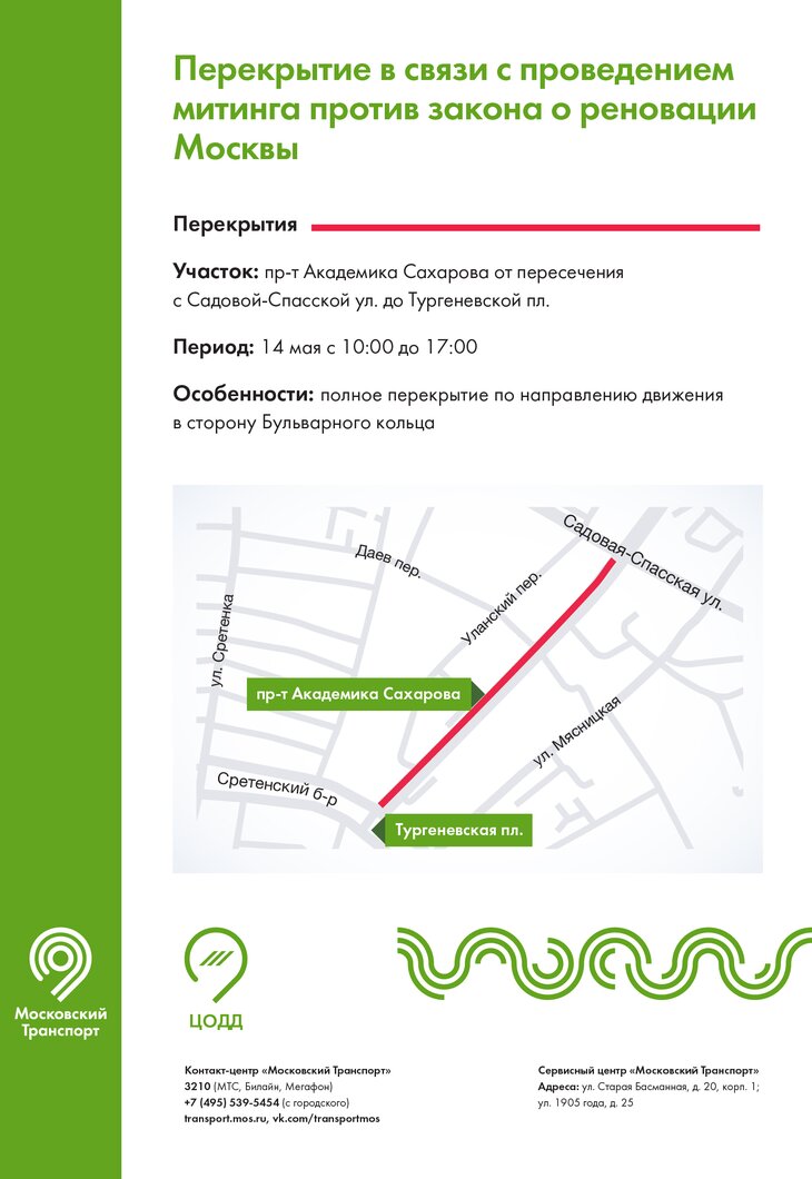 С 10:00 до 17:00 будет перекрыт участок проспекта Академика Сахарова от пересечения с Садовой-Спасской улицей до Тургеневской площади. Ограничения будут действовать на всех полосах по направлению в сторону Бульварного кольца.