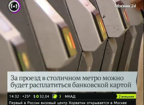Столичный департамент транспорта представил турникет, принимающий для оплаты проезда бесконтактные платежные карты Visa payWave. Первые станции метро оснастят новыми турникетами осенью 2013 года.