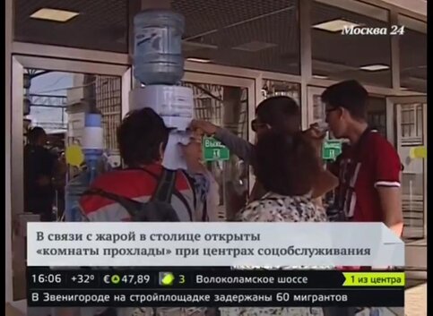 Из-за жары начали раздавать питьевую воду не только в метро, но и в пригородных электричках. Кроме того, воду будут предлагать посетителям столичных парков и учреждений культуры. По словам главы департамента культуры Сергея Капкова, в парках также организуют крытые площадки на свежем воздухе, а в учреждениях культуры создадут зоны отдыха, оборудованные кондиционерами или вентиляторами.