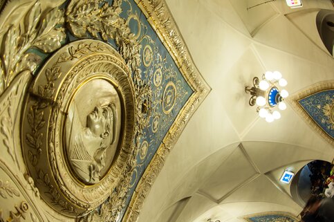 И этим шествием мы попадаем под землю, в некое храмовое пространство. Трехнефная базилика читается там совершенно однозначно. По краям пилонов – портреты людей в военной форме, но без надписей. Такая гробница неизвестных героев, это можно так интерпретировать.