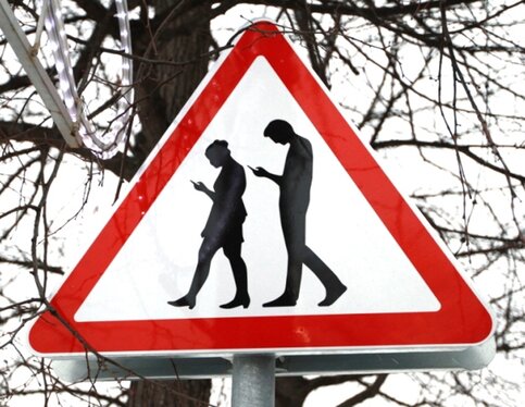 Красный треугольник с фигурами людей, уткнувшихся в смартфоны, посетители окрестили "Осторожно: зомби!".