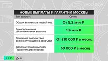 В сумму входит единовременная выплата столичного правительства в размере 1,9 миллиона рублей и ежемесячное денежное довольствие военнослужащего в зоне СВО, которое составляет от 210 тысяч рублей. Также туда входит дополнительная выплата в размере 50 тысяч рублей в месяц.