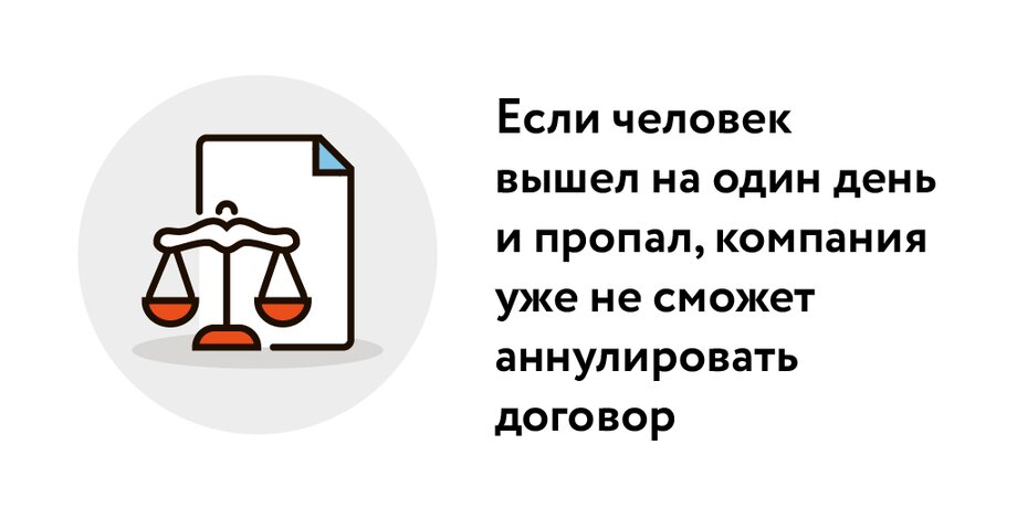 Но если человек вышел на один день и пропал, компания уже не сможет аннулировать договор, потому что обязана выяснить обстоятельства отсутствия работника. А сделать это невозможно, пока он не явится лично или не ответит на звонок. В этом и состоит основная трудность, подчеркнула юрист.