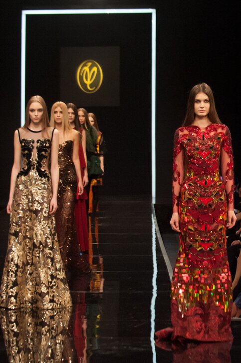 Открылась Неделя моды показом именитого российского модельера Валентина Юдашкина, который представил свою коллекцию prêt-a-porter осень-зима 2015/16. По собственному признанию кутюрье, Янтарная комната Екатерининского дворца в Царском Селе стала источником вдохновения для создания коллекции. История комнаты с XVIII века до наших дней с ее таинственным исчезновением и последующей реконструкцией стала своеобразным символом ускользающей красоты, собственную концепцию которой предложил модельер.