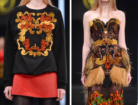 Прежде всего бросается в глаза сочетание орнаментов, вдохновленных Янтарной комнатой и отсылающих нас к XVIII веку, с силуэтами в стиле 70-х годов века двадцатого. Архитектурные орнаменты на мини-юбках, аппликации, напоминающие барочные гербы, на свитшотах и барочно-вычурный красный на вечерних платьях, усиленный блеском разноцветного стекляруса и раппортами на ткани…
