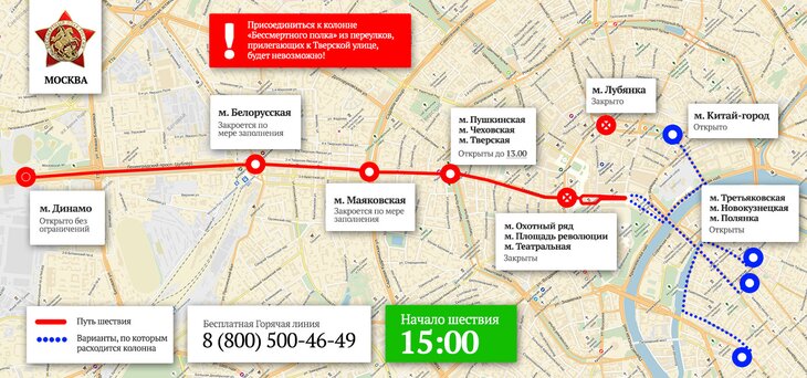 Шествие начнется в 15:00. Для прохода на Тверскую улицу будут открыты метро "Динамо", "Белорусская", "Маяковская", "Пушкинская". Станции метро "Театральная" и Площадь революции" будут закрыты.