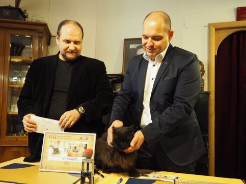 За происходящим с важным видом наблюдал почетный житель дома кот Бегемот вместе с филателистами и посткроссерами (участниками международного движения по обмену открытками). В церемонии также приняли участие директор музея-театра Николай Голубев и глава московского филиала Почты России Алексей Корякин.