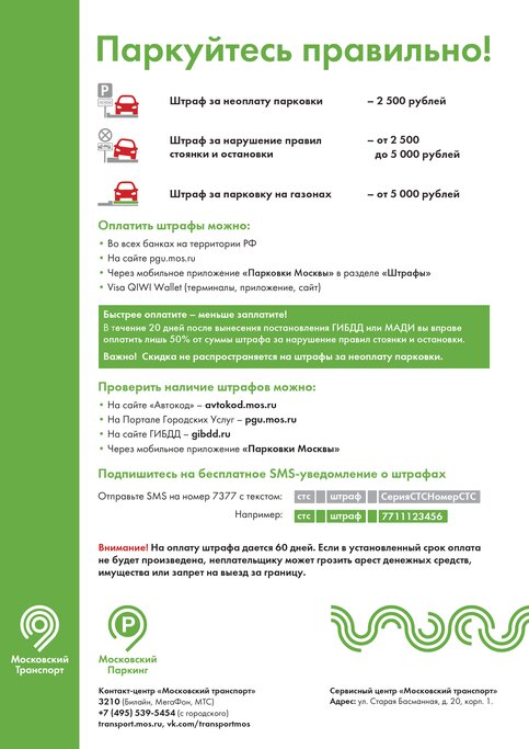 В листовке указаны источники, где автомобилисты могут узнать о наличии штрафов: это avtokod.mos.ru, pgu.mos.ru, gibdd.ru, мобильное приложение "Парковки Москвы". Также о штрафах можно узнать, подписавшись на бесплатную SMS-рассылку.