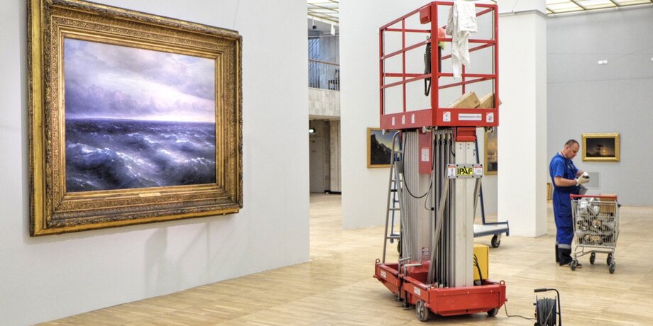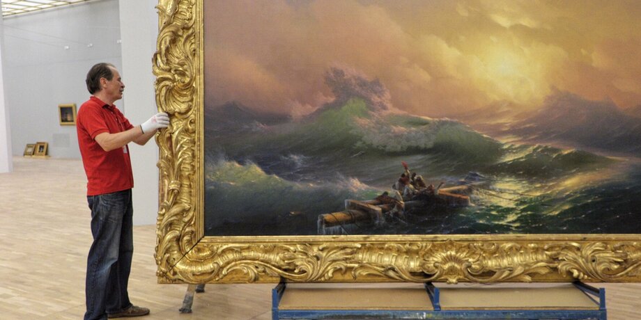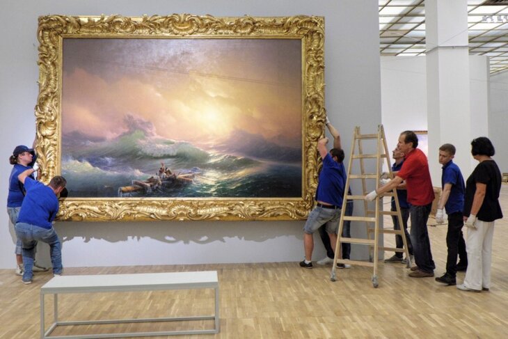 Самое узнаваемое полотно Айвазовского "Девятый вал" и вовсе путешествовало из Петербурга в Москву в эксклюзивных условиях. Для картины размером 221 на 332 сантиметра в тяжелой золоченой раме у специалистов заказали уникальный саркофаг, чтобы исключить возможность малейшего повреждения. В столицу все работы прибыли в идеальном состоянии.