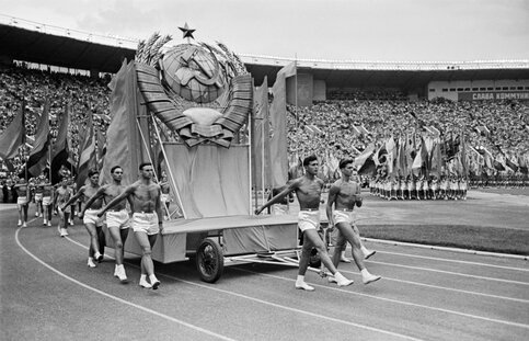 Событием мирового уровня на стадионе "Лужники" в 1957 году стала церемония открытия VI Всемирного фестиваля молодежи и студентов в Москве – первого после десятилетий плотного "железного занавеса" и "холодной войны" итога разрядки напряженности между Востоком и Западом.