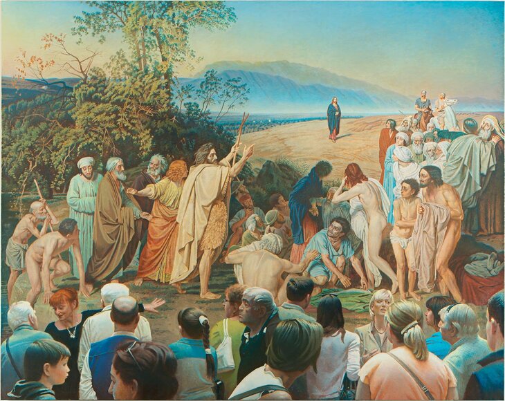 В работах "Картина и зрители" и "Лувр. Джоконда" Булатов накладывает изображение толпы поверх произведения классической живописи. В данном случае он копирует "Явление Христа народу" Александра Иванова, подчеркивая тем самым идею вечно прекрасного искусства и скоротечности жизни: vita brevis ars longa, как говорили древние римляне. Более того, в этой картине толпа зрителей в зале галереи сливается с изображением толпы на картине, что создает дополнительную пространственную и смысловую игру.
