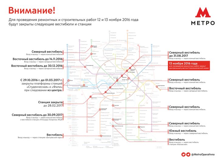 Также будут частично закрыты вестибюли станций "Савеловская", "Третьяковская" и "Воробьевы горы". Кроме того, до 14 ноября закрыт восточный вестибюль станции "Сокол", а до 31 декабря 2016 года –восточный вестибюль "Полежаевской".