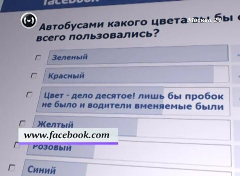 Жителям столицы предлагают ответить на вопрос: "Автобусами какого цвета вы бы охотнее всего пользовались?" и выбрать один из представленных цветов: синий, желтый, белый, красный или зеленый.