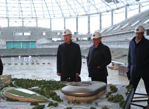 Сергей Собянин и президент банка ВТБ Андрей Костин 3 апреля осмотрели ход работ по реконструкции стадиона "Динамо" и строительству станции метро "Петровский парк" Третьего пересадочного контура московского метрополитена.