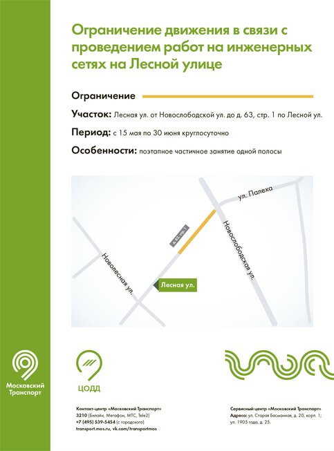 Ограничения вводятся на участке от Новослободской улицы до дома № 63, строение 1 по Лесной улице. Работы будут вестись круглосуточно с 15 мая по 30 июня. На данном участке будет осуществляться поэтапное частичное перекрытие одной из полос проезжей части.