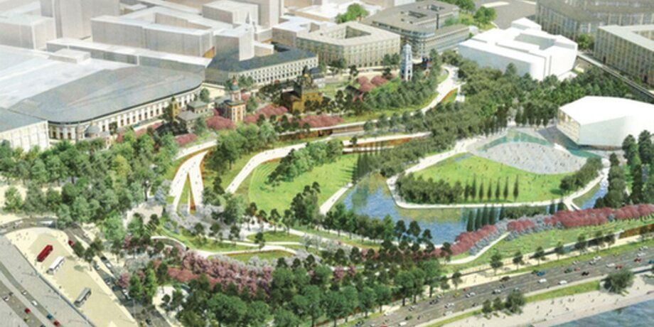 На территории парка создадут характерные для России природные зоны — лес, степь, заливные луга и северный ландшафт. Они террасами спустятся от улицы Варварки к Москве-реке.