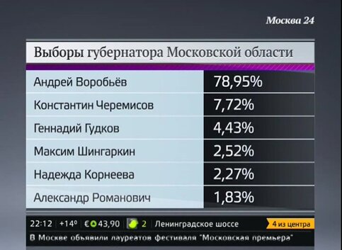 Второе место занял Константин Черемисов (КПРФ) - 7,72%, третье - Геннадий Гудков (партия "Яблоко") - 4,43%. Максим Шингаркин (ЛДПР) набрал 2,52%, Надежда Корнеева ("Патриоты России") - 2,27%; завершает список Александр Романович ("Справедливая Россия") с 1,83%.