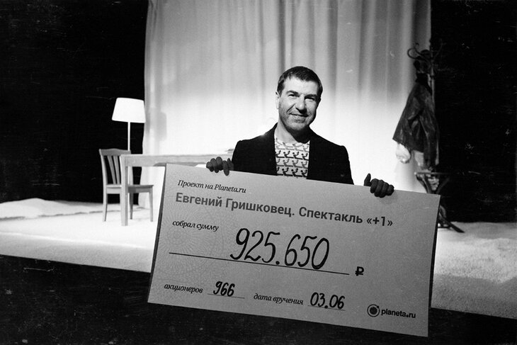 К краудфандингу Гришковец обратился на той стадии, когда запись видеоверсии спектакля "+1" уже была готова, а вот средства для оплаты работы монтажеров, дизайнеров DVD и многих других необходимых для работы профессионалов нужно было искать. Организаторы проекта поставили перед собой цель собрать 900 тысяч рублей. И, конечно же, успешно ее осуществили.