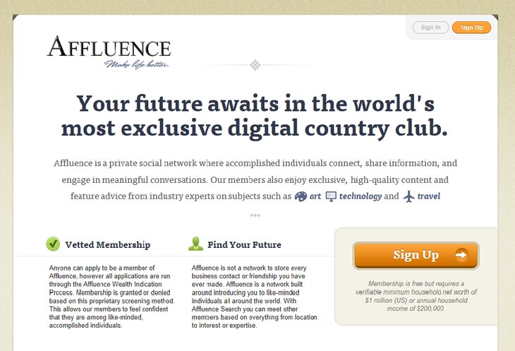 Перевод названия этой социальной сети звучит как "богатство". Это частный проект, членство в котором совершенно бесплатно, однако, чтобы вступить в круг избранных, вам стоит поднакопить миллион-другой долларов или выпросить у шефа зарплату, которая была бы не меньше 300 тысяч долларов в год.