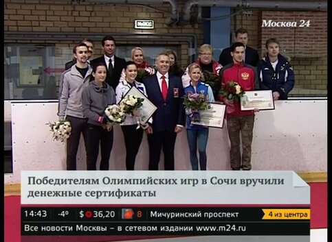 Денежные сертификаты фигуристам вручили глава департамента физической культуры и спорта Москвы Алексей Воробьев и его первый заместитель, олимпийский чемпион Николай Гуляев.