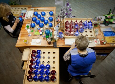 Высохшие игрушки вручную раскрашивают художники, после чего изделия упаковывают и отправляют на склад. Всех мастеров фабрика выращивает у себя. На обучение стеклодува уходит полгода, а художником при наличии таланта и любви к рисованию можно стать за месяц.