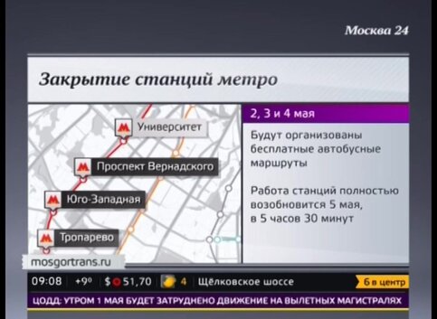 Так, 2, 3 и 4 мая закроются станции "Проспект Вернадского", "Юго-Западная" и "Тропарево". Поезда будут ходить от станции "Бульвар Рокоссовского" только до станции "Университет", которая станет временной конечной с пересадкой на компенсационный автобус маршрута "М". Бесплатные автобусы будут курсировать с остановками у трех закрытых станций.