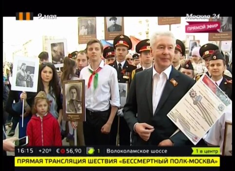 Мэр Москвы присоединился к шествию "Бессмертны полк", которое проходит в центре города. Участие в акции принимают более 300 тысяч человек. Москвичи и гости столицы вышли с портретами своих родственников, защищавших Родину в годы Великой Отечественной войны.