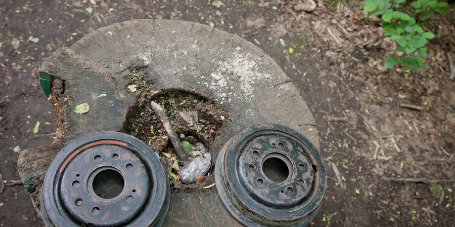 Жимовые скамейки – это просто доски, неровные, с сохранившемся рисунком дерева: так что после подхода этот рисунок можно наблюдать у вас на спине. Стойки для штанги либо слишком заужены, либо, наоборот, широкие. Поэтому для работы со штангой вам понадобится напарник. Грифы у этих штанг разного диаметра, а некоторые просто ржавые. Роль гантелей выполняют тормозные диски от машин, разного наминала: где-то от двух до пяти килограммов. А "блинами" на штанге служат канализационные люки или колесные диски от "Газели".