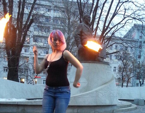 – Я уже говорила о том, что первых в своей жизни фаерщиков я встретила на Арбате. Несколько лет спустя я снова их встретила. Они увидели неофита, а тогда новичков в файршоу было мало и к ним еще проявляли живой интерес – и отвели меня на Болотную. А потом судьба еще раз выкинула кульбит: в скором времени наши дороги с ними разошлись, а сейчас сошлись обратно и мы опять работаем все вместе, но уже на профессиональном уровне.
