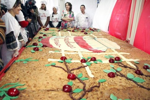 Это не первое угощение больших размеров, которое раздают москвичам и гостям города. Например, в рамках фестиваля "Путешествие в Рождество" 7 января на Манежной площади испекли гигантский праздничный пирог. Размеры пирога с начинкой из яблок и вишни превысили 3,5 на 2,5 метра. Для его изготовления потребовалось более 50 килограммов муки и 30 яиц.
