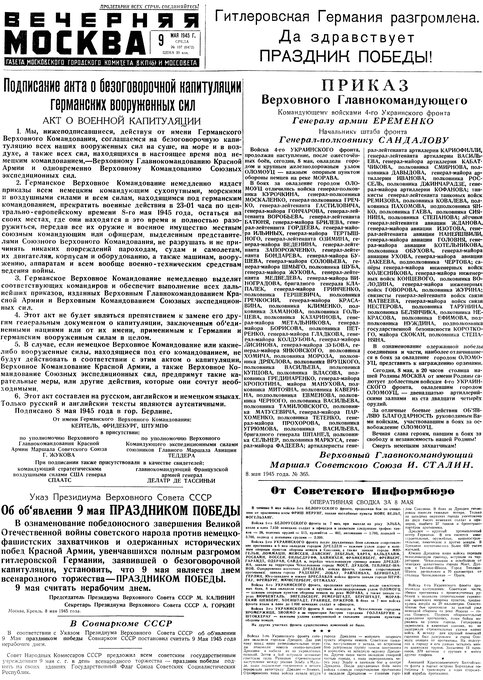 Я, как и весь наш народ, ждал того часа, когда можно будет объявить о падении Берлина. Этот день настал. 2 мая я читал приказ товарища Сталина № 359. А сегодня, в 2 часа 10 минут после полуночи, я прочитал сообщение о безоговорочной капитуляции Германии.