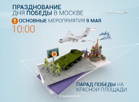 9 мая на пяти медиазонах, четырех медиафасадах и медиакубе состоится прямая трансляция парада Победы на Красной площади, минуты молчания, а также видео парада Победы 1945 года.