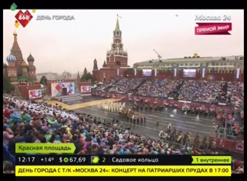 Утром на Тверской улице, несмотря на непогоду, прошло шествие военных оркестров. Музыканты из России, Белоруссии, Китая, Ирландии, Казахстана, Италии, Мексики, Пакистана и других стран сыграли не только традиционные мелодии, но и такие известные песни как "Катюша".