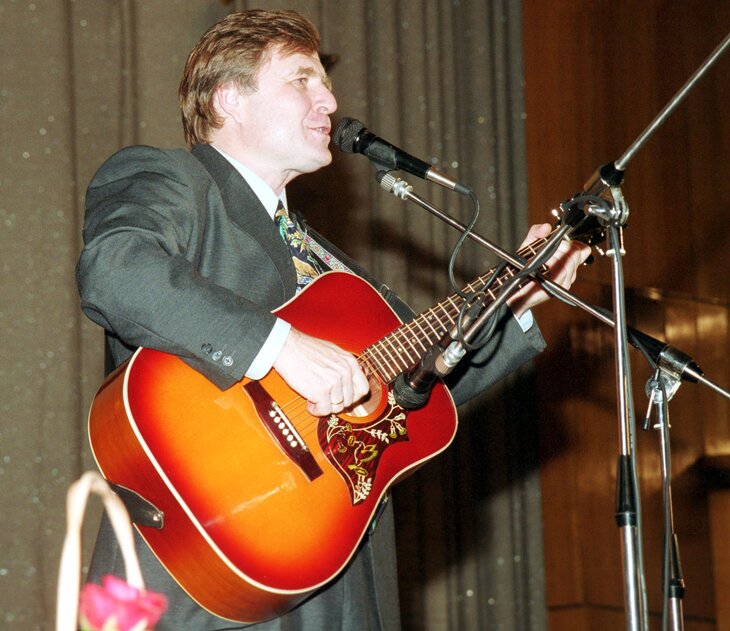 Композитор Григорий Гладков исполняет свои песни у кинотеатра мультипликационного фильма "Баррикады". Фото: ТАСС/Александр Шогин