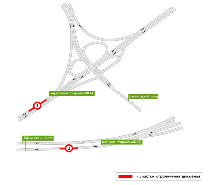 Так, до 5 апреля закрыт участок на краевой полосе (край проезжей части, заходящий на обочину) 79-го километра МКАД около Бусиновской развязки, а до 15 апреля – краевая полоса на внешней стороне 77-го километра МКАД, около Химкинского моста.