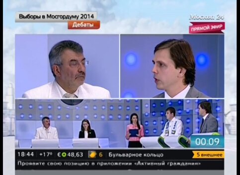 Ведущая: Спасибо вам большое, а нашим телезрителям я напомню, что это были дебаты кандидатов на пост депутатов Московской городской Думы. Мы увидимся с вами на телеканале "Москва 24" в понедельник, 1 сентября, в 15.30, так что не пропустите.