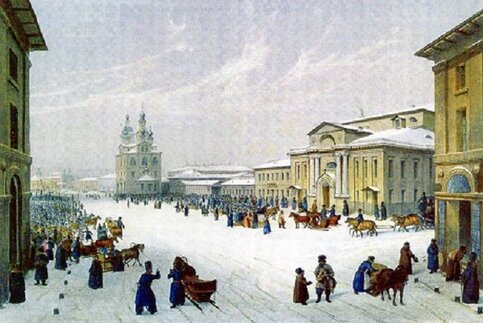 Дом Дворянского собрания на улице Охотный ряд в Москве. Литография А. Гедона и П.М. Русселя с оригинала Ф. Дица. Начало 1850-х годов