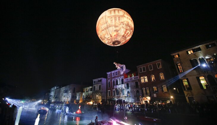 А в районе моста Риальто гостей встречал летящий в воздухе пианист с роялем. Надо сказать, что такой вариант исполнения музыки практикуют и в итальянских театрах.
