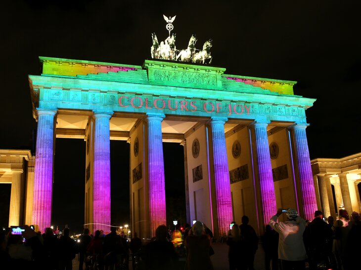 Знаменитые Бранденбургские ворота подсветили цветами радости: сиреневым, зеленым, желтым и синим.