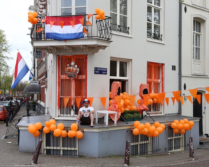 Амстердамцы традиционно украшают свои дома национальной атрибутикой, а также надевают одежду с оранжевым цветом, ведь имя королевской семьи дословно звучит как "Дом оранжевых".