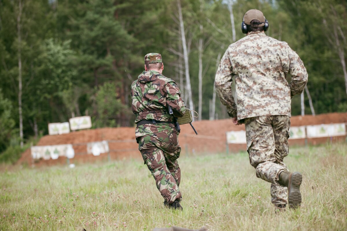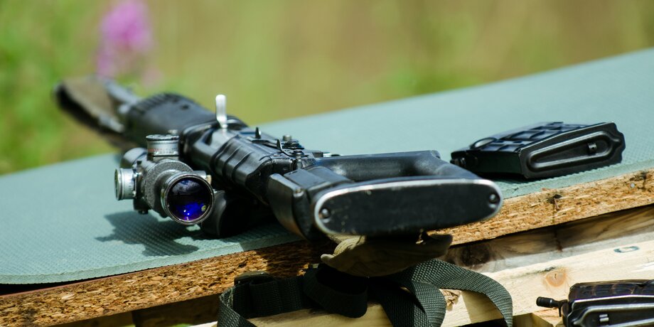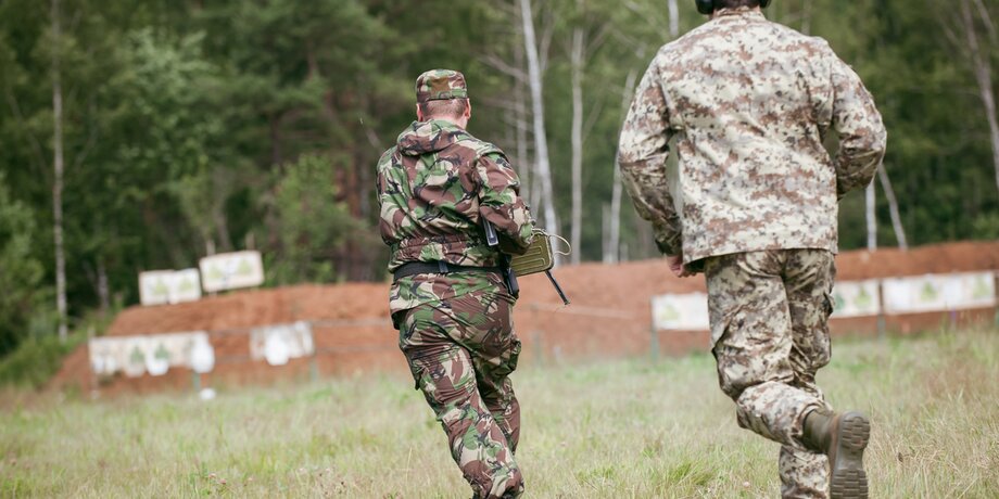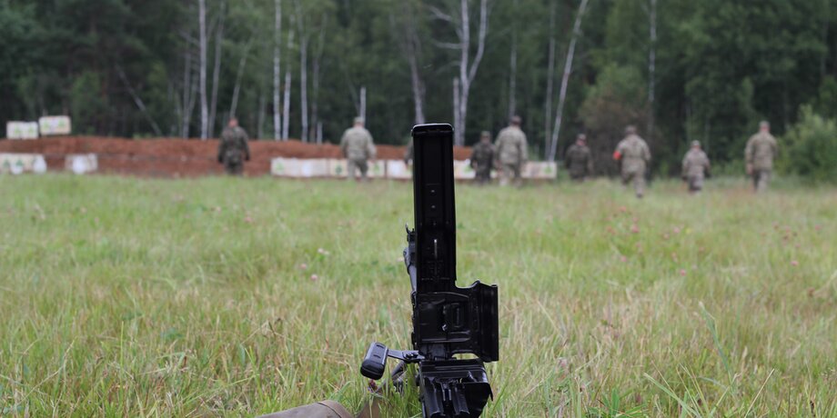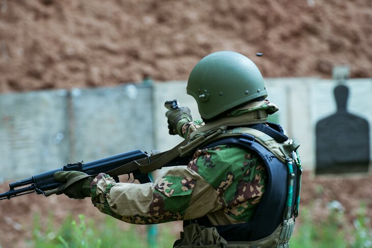 После всех процедур стрелки выстраиваются по пятеро, их инструктирует руководитель: "Автомат вниз под 45 градусов, работаем только по сигналам". Бойцы передергивают затворы оружия и встают в стойку, взгляд направлен на мишень – каждому по две.