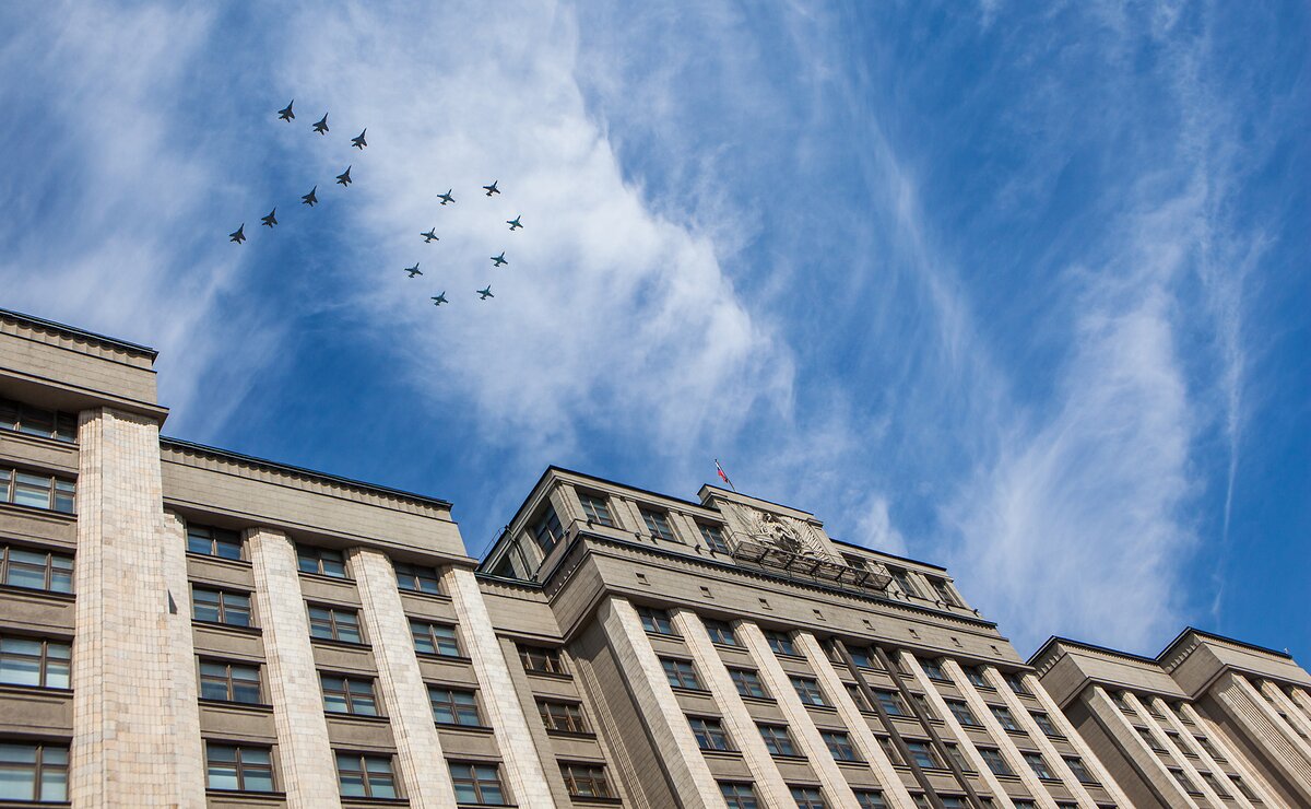 Композиция 70, посвященная юбилею Победы. Фигуру составили 15 самолетов МиГ-29 и Су-25.