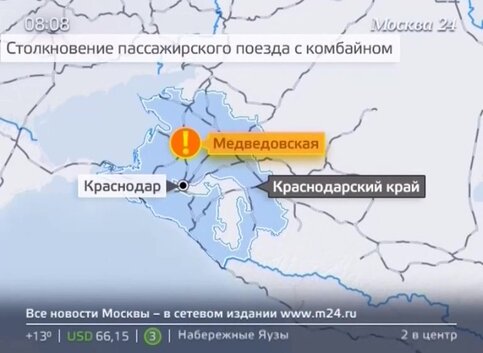 Инцидент произошел в 05.20 мск в районе станицы Медведковская Тимашевского района. Столкновение произошло на регулируемом железнодорожном переезде". Движение поездов остановлено в одном направлении.