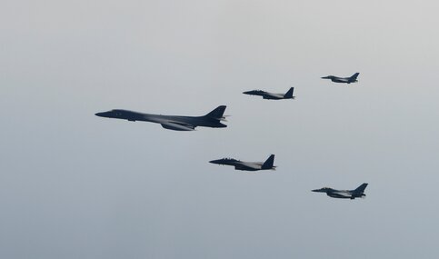 Два сверхзвуковых американских бомбардировщика B-1B, которые могут перевозить на борту ядерное оружие, принимают участие в военно-воздушных учениях в Южной Корее, сообщает "Газета.ру".