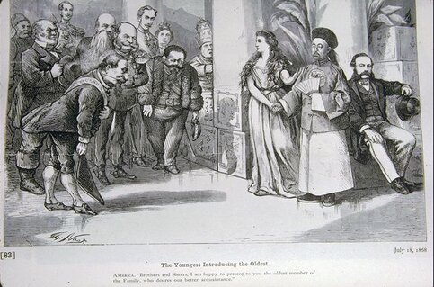 А вот она же на карикатуре "Младший представляет Старейшего", олицетворяя Америку вводит Китай в "семью народов", вернее в клуб великих держав.