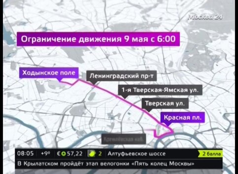 Добавим, что движение будет ограничено и на 9 мая. Техника пойдет от Ходынского поля по улицам Авиаконструктора Микояна и Авиаконструктора Сухого, Ленинградскому проспекту, 1-й Тверской-Ямской и Тверской улицам.