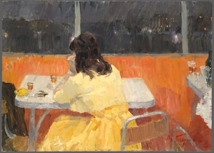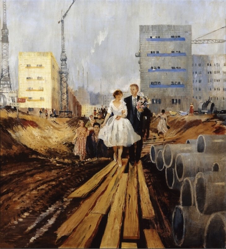 Юрий Пименов был одним из художников, изобразивших 1960-е как эпоху надежд за секунду до светлого будущего. Стройки, свадьбы, молодые ученые, автомобили – все это мчится навстречу завтрашнему дню. Его картины напоминают киноафиши, что не случайно: Пименов работал и как график-иллюстратор, и как театральный декоратор. Его талант был признан еще в сталинские времена, соцреализм такого толка был прост и понятен вождю. Но именно в 60-е Пименов стал одним из главных художников СССР. Для него была важна не столько советская реальность, сколько реальность жизненная во всех своих проявлениях.
